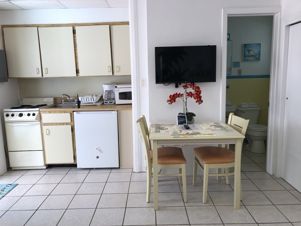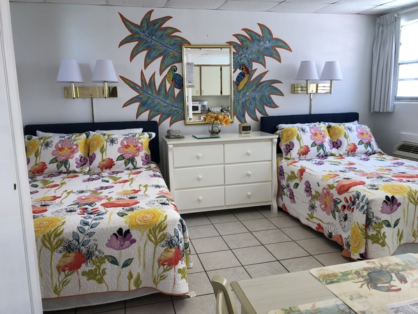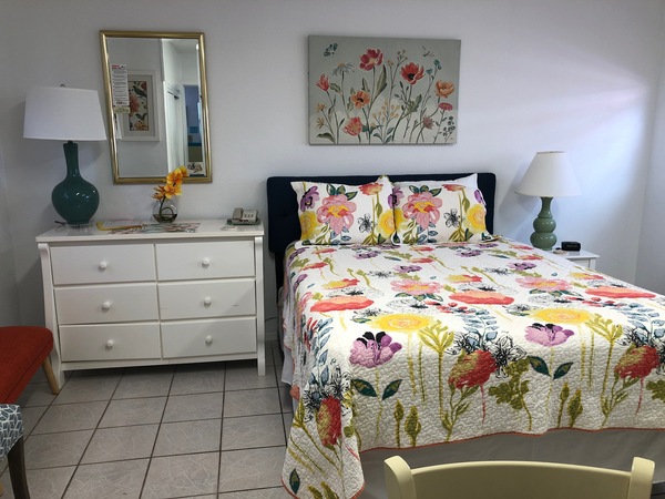 Excellent Value - Bright and Colorfully Furnished. This room is furnished with 1 Queen Bed on most dates, and 2 Double Beds During the Summer. Perfect for a Couple. Very Convenient Location on First Floor Just a Short Walk to Pool Area. Full Kitchen. Small bathroom with newly updated shower. Shared Ocean View Patio. Please note that this room is small and does not have a view due to its interior location. But, it is very affordably priced and is very conveniently located on the first floor, close to our pool area.